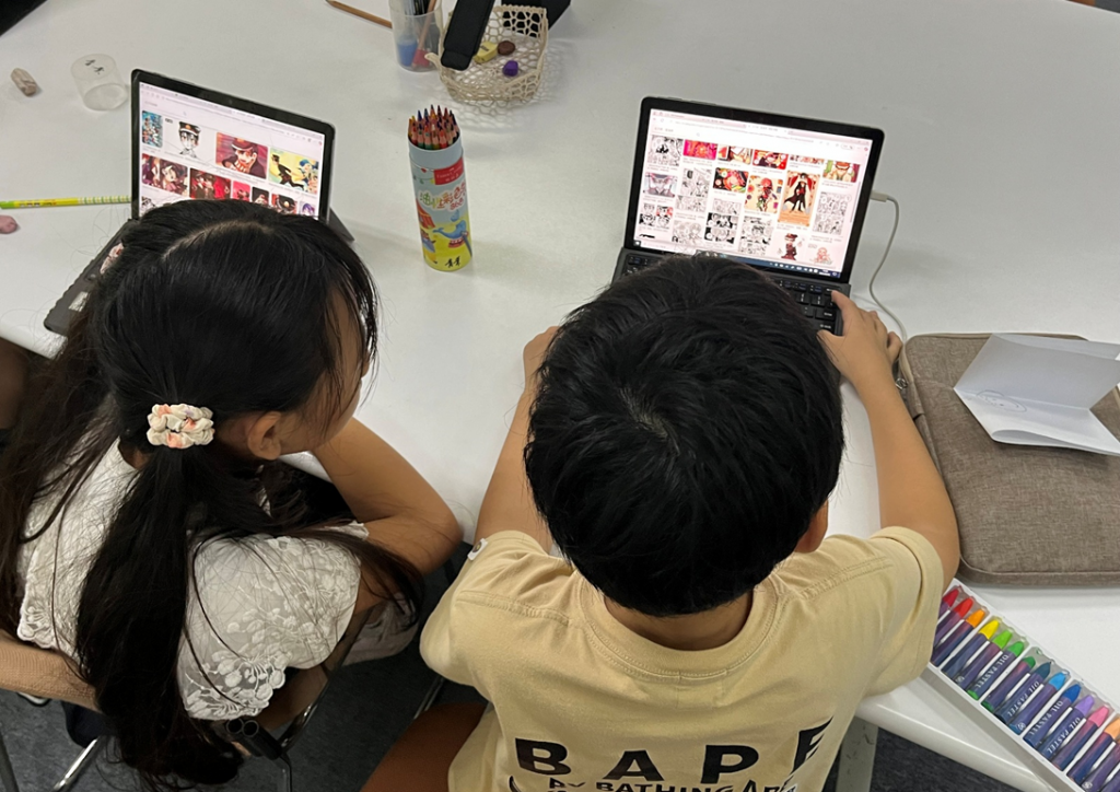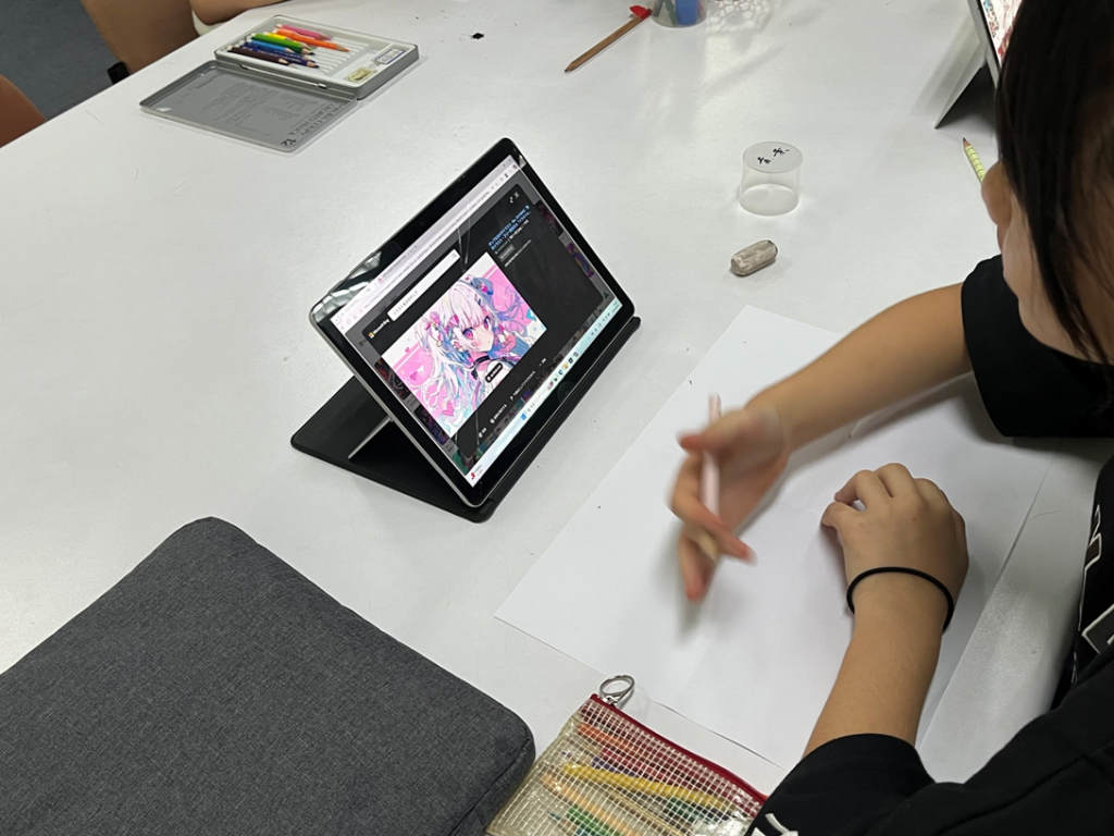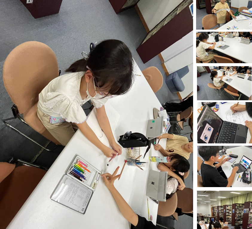 9月は、イラストクラブの活動の様子を紹介します。図書室に入るとしんとした空気が流れていました。子どもたちが集まる一角では、それぞれが表したいキャラクターや漫画の一コマを一生懸命描いていました。線を描いては消し、新しい線を加えながら好みのイラストに仕上げていきます。色を塗った自信作を11月1日(土)の学習・生活発表会の展示コーナーに飾ることとしており、準備は着々と進んでいるようです。「絵の好きな友達が集まった月に一回のとても楽しいひと時です」クラブ長からこのコメントをもらいました。