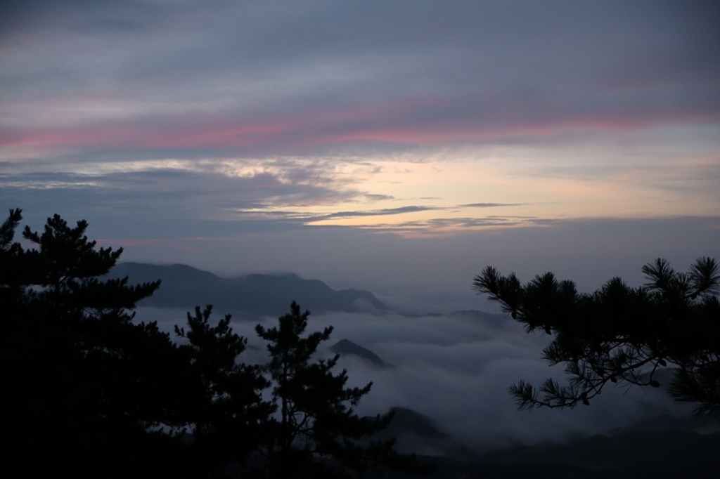 翌朝は10名が5時に集合して、ご来光を見に行きました。天気が心配されましたが月やオリオン座も見えており、期待が高まります。ご来光見るのに絶好な場所に到着し、朝焼けなどを堪能しましたが、西側に雲が厚かったようでご来光を見ることはできず。でも雄大な雲海や刻々と変化する朝焼けを堪能できました。