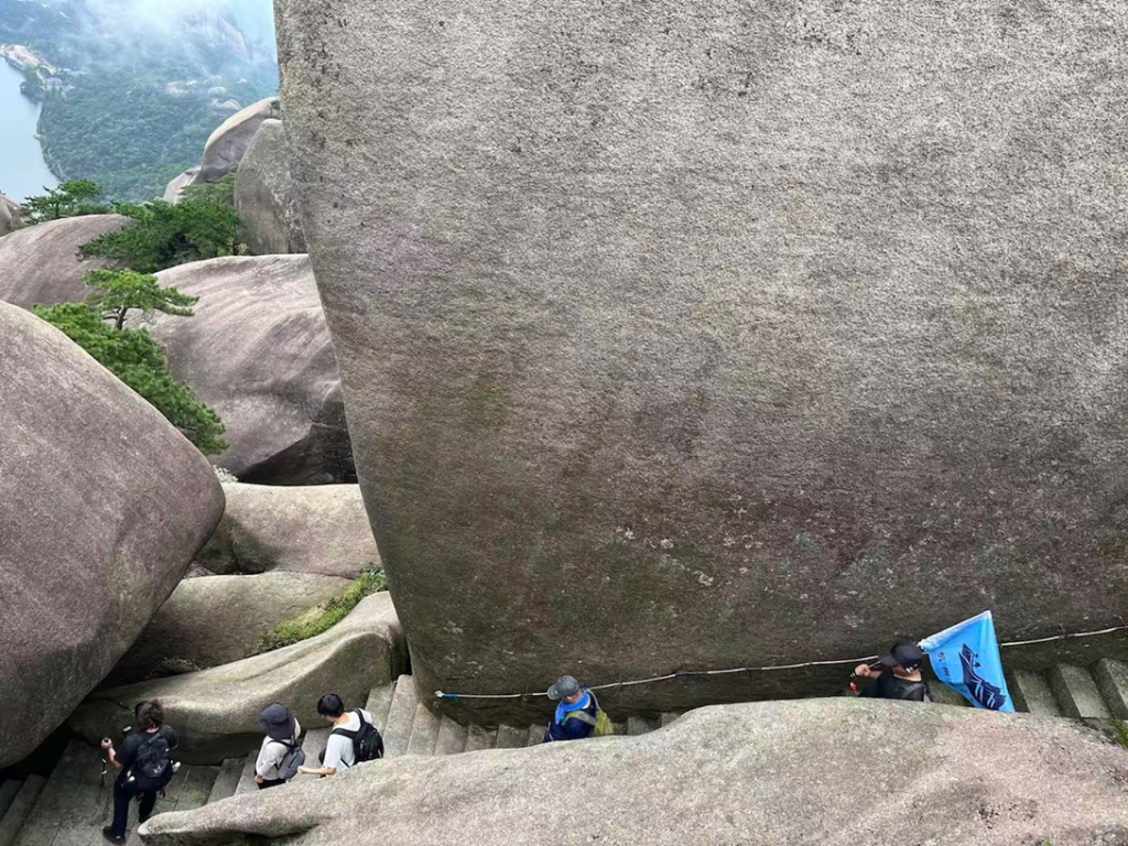 今回は今年2回目の高鉄を利用した宿泊登山です。参加者15名は各自それぞれの出発地から高鉄に乗り、10時40分に安徽省西側にある潜山駅に集合しました。天気は二日とも雨予報、新幹線の移動の途中でも雨が降っており、悪天候の不安もありながらのスタートとなりました。潜山駅からは手配したバスでロープウェイ駅に移動し、龍潭河ロープウェイで中腹まで上ります。現地は曇り空、ロープウェイが登っていくと霧の中に突入し、見渡す限り真っ白となり前後左右が分からなくなりましたが、やがて霧の上に出て、青空も見えました。ほっとしながら登山活動を開始しました。