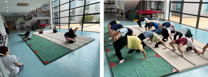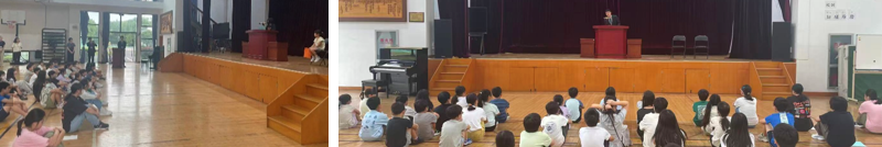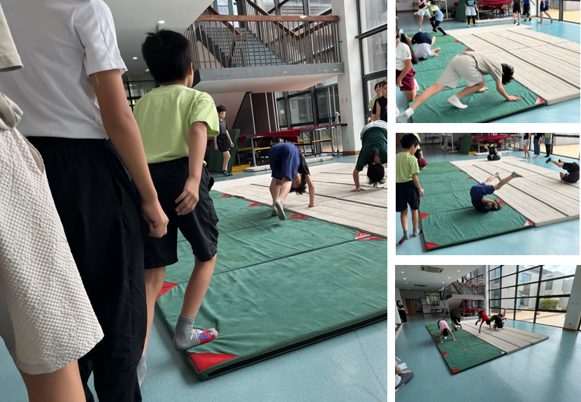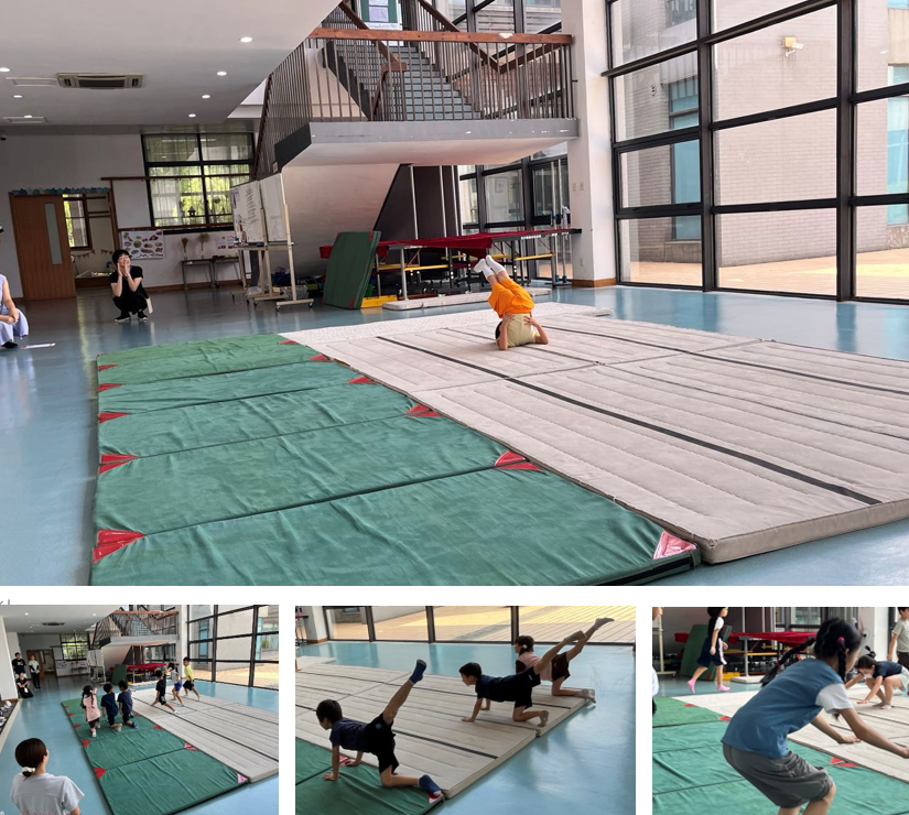 9月のことですが、体育では、マット運動に取り組んでいました。回転したり倒立したり、日ごろの生活では、使わない筋肉や感覚を活用するため、苦手意識の高い子どもが多くいます。そんな中、マットを組み合わせて床運動の場をつくり、発表し合う会が体育の時間に企画されました。みんなに見てもらえる、また、見せてもらえることから、やる気もぐんと高まり、練習にも熱が入っていました。ちょうど、暑い時期で、体育館では運動ができないため、玄関ホールで繰り返し練習に取り組んでいました。いよいよ発表会では、都合のつく保護者の方々にご来校いただき、みんなで演技を応援することができました。マット運動が好きになった子どももいたようです。また、自分の課題に合わせて工夫して練習したことで、できるようになった喜びを感じた子どもも多かったです。