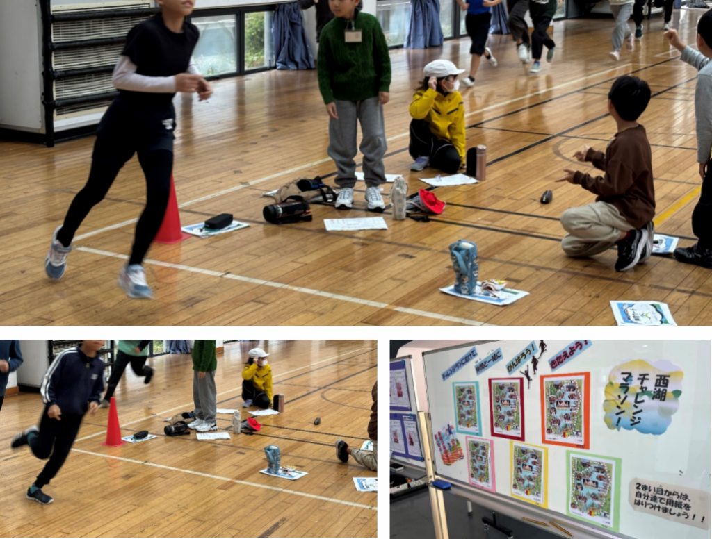 朝の時間にチャレンジランを行っています。5分間でどれだけの距離を走れるか、自分との闘いに挑戦しています。初めて取り組む日は、朝からあいにくの雨模様…。しかし、体育館の階段やギャラリー(2階)を使って走りました。その後、「西湖チャレンジマラソン」も始まりました。各学年やブロックでグラウンドを走った周数分カードを塗っていき、西湖の周りをどれだけ走れるか!?これもチャレンジしています。先日、放課後の時間にたった一人で走っている子どもが見られました。こんな運動に親しむ子どもの輪が広がっていくといいと思います。