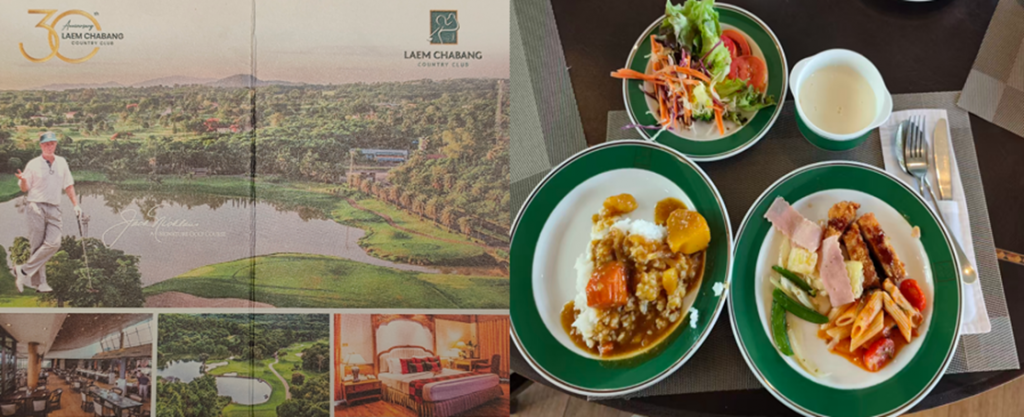最終日はLAEM CHABANGカントリークラブでBとCコースをプレーしました。池超えとなることが多く、戦略性が必要となるコースでした。キャディーさんとも楽しく会話をしながら、プレーをしていたらあっという間の18ホールでした。納得のいくスコアは出せませんでしたが、とても楽しい思い出となりました。