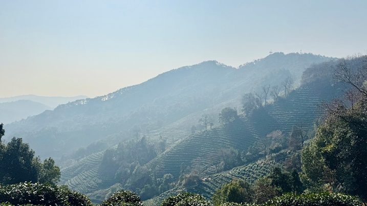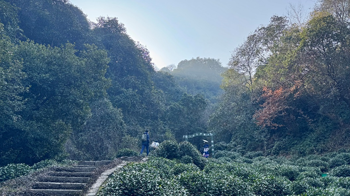 尾根までの標高差200mを1時間弱で登りました。尾根に出ると、尾根沿いを登山していた他の登山者が沢山いました。この辺りは他の登山口からもアクセスできるので天気の良い週末はいつも多くの登山者がいます。路線が交差する場所には飲み物などを売っている場所もあり、子供と一緒に参加された方はキュウリを買っていました。日本人的には味噌が欲しくなりますが、中国の方にとっては果物の感覚みたいですね。 ↓尾根からは美しいお茶畑が見えます。名茶の産地です。