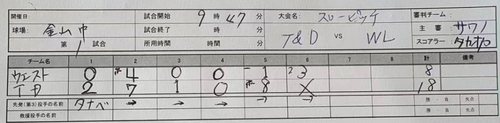 1試合目はスローピッチのルールで試合です。蘇州チームは日頃からスローピッチのルールで試合をされており、相手のホームルール。ファストピッチとの主な違いはストライクゾーンで、1.8m以上の山なりボールをホームベース上に敷かれたマットに落とせばストライクです。