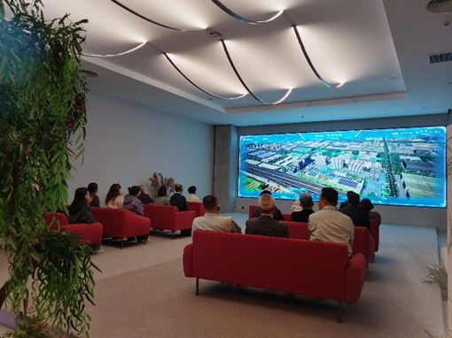 第一部は、蕭山にある圣奥科创园の展示場で、圣奥科技様の会社紹介ならびに製品紹介を行って頂きました。展示場は壁面緑化や屋上庭園が設けられたユニークな建物で、アジア最大級の展示場との事です。今回は5階建ての展示場の1階のみの見学となりましたが、電動で昇降するデスクやオフィスチェアなど、様々なオフィス家具製品に実際に触れながら見学することができました。事務所、会議室をイメージしたオフィス空間を体験したり、総経理室をイメージしたスペースの立派な椅子に座ってみたり、皆さんしっかり体感する事ができました。