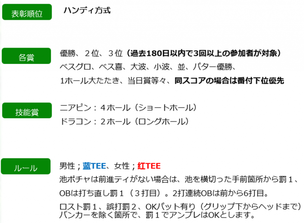 日時;毎月土曜日1回から2回、ゴルフ練習ラウンド開催。四半期に一度コンペ開催予定。