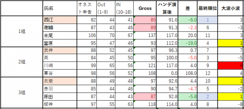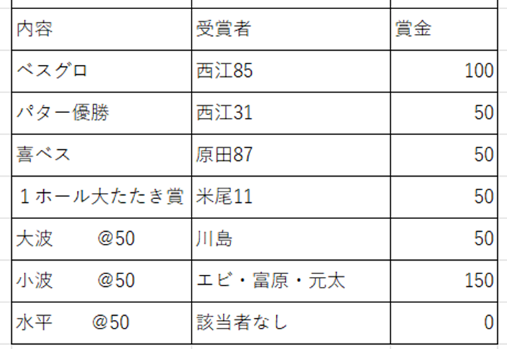以下のコンペルールにて各賞があり、参加者は12名、天候にも恵まれてスコアも良かったです。