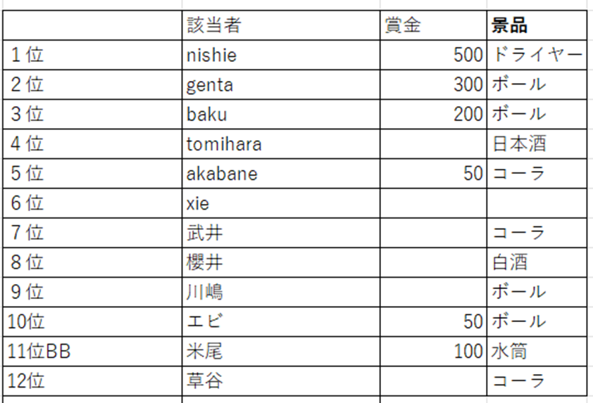 ゴルフプレー後は京橋亭にて表彰式を行いました。参加者全員に景品があり、12位からくじ引きを引いて景品が当たるユニークな方法でした。景品はゴルフグッズ以外に日本酒や家電製品などもありました。